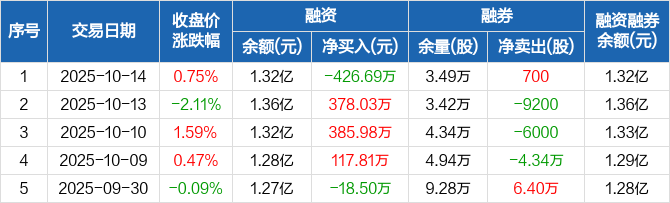 融资方面,当日融资买入586.84万元,融资偿还1013.54万元,融资净偿还426.69万元。融券方面,融券卖出1000股,融券偿还300股,融券余量3.49万股,融券余额37.45万元。融资融券余额合计1.32亿元。
