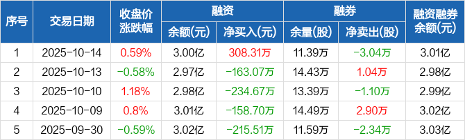 融资方面,当日融资买入1123.69万元,融资偿还815.38万元,融资净买入308.31万元。融券方面,融券卖出1.27万股,融券偿还4.31万股,融券余量11.39万股,融券余额58.43万元。融资融券余额合计3.01亿元。