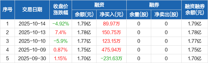 融资方面,当日融资买入2492.83万元,融资偿还2402.86万元,融资净买入89.97万元,连续4日净买入累计839.82万元。融券方面,融券卖出0股,融券偿还0股,融券余量0股,融券余额0元。融资融券余额合计1.79亿元。