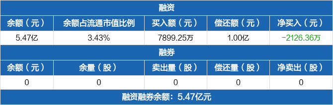 融资方面,当日融资买入7899.25万元,融资偿还1亿元,融资净偿还2126.36万元。融券方面,融券卖出0股,融券偿还0股,融券余量0股,融券余额0元。融资融券余额合计5.47亿元。