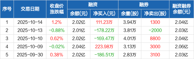 融资方面,当日融资买入1379.73万元,融资偿还1268.5万元,融资净买入111.23万元。融券方面,融券卖出1500股,融券偿还200股,融券余量3.94万股,融券余额211.93万元。融资融券余额合计2.04亿元。