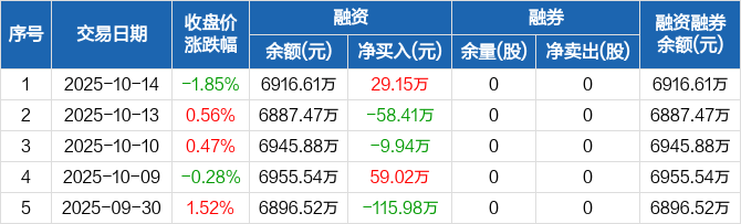 融资方面,当日融资买入198.15万元,融资偿还169万元,融资净买入29.15万元。融券方面,融券卖出0股,融券偿还0股,融券余量0股,融券余额0元。融资融券余额合计6916.61万元。