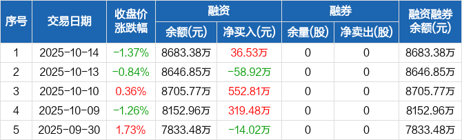 融资方面,当日融资买入709.12万元,融资偿还672.59万元,融资净买入36.53万元。融券方面,融券卖出0股,融券偿还0股,融券余量0股,融券余额0元。融资融券余额合计8683.38万元。