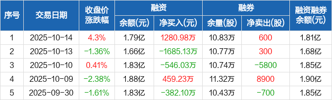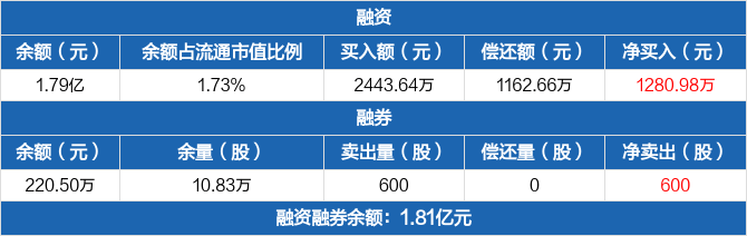融资方面,当日融资买入2443.64万元,融资偿还1162.66万元,融资净买入1280.98万元。融券方面,融券卖出600股,融券偿还0股,融券余量10.83万股,融券余额220.5万元。融资融券余额合计1.81亿元。
