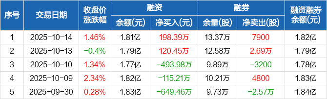 融资方面,当日融资买入1949.64万元,融资偿还1751.25万元,融资净买入198.39万元。融券方面,融券卖出7900股,融券偿还0股,融券余量13.37万股,融券余额102.01万元。融资融券余额合计1.82亿元。