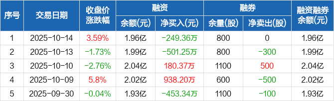 金辰股份融资融券信息显示,2025年10月14日融资净偿还249.36万元;融资余额1.96亿元,较前一日下降1.25%