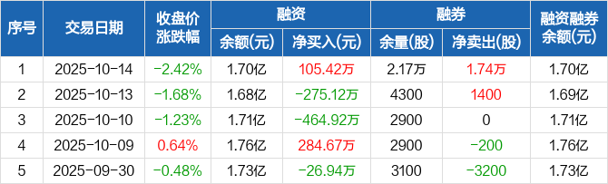 融资方面,当日融资买入1532.41万元,融资偿还1426.99万元,融资净买入105.42万元。融券方面,融券卖出1.79万股,融券偿还500股,融券余量2.17万股,融券余额38.52万元。融资融券余额合计1.7亿元。