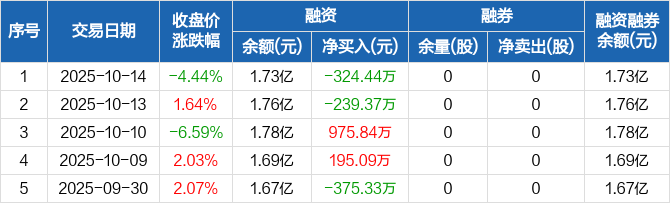 融资方面,当日融资买入1612.01万元,融资偿还1936.45万元,融资净偿还324.44万元。融券方面,融券卖出0股,融券偿还0股,融券余量0股,融券余额0元。融资融券余额合计1.73亿元。
