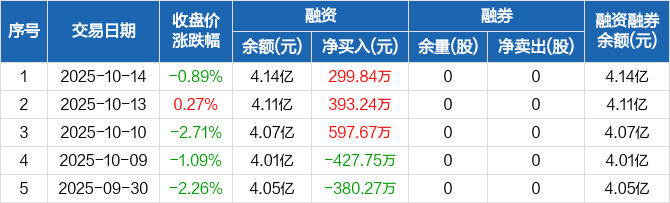 融资方面,当日融资买入927.73万元,融资偿还627.89万元,融资净买入299.84万元,连续3日净买入累计1290.75万元。融券方面,融券卖出0股,融券偿还0股,融券余量0股,融券余额0元。融资融券余额合计4.14亿元。