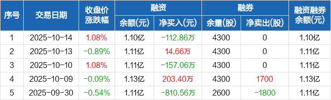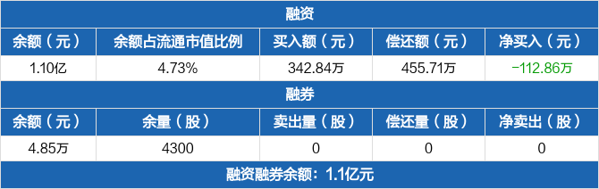 融资方面,当日融资买入342.84万元,融资偿还455.71万元,融资净偿还112.86万元。融券方面,融券卖出0股,融券偿还0股,融券余量4300股,融券余额4.85万元。融资融券余额合计1.1亿元。