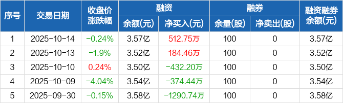 融资方面,当日融资买入1842.08万元,融资偿还1329.33万元,融资净买入512.75万元。融券方面,融券卖出0股,融券偿还0股,融券余量100股,融券余额1234元。融资融券余额合计3.57亿元。