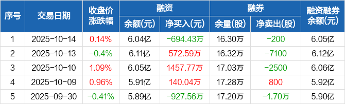 融资方面,当日融资买入2216.69万元,融资偿还2911.12万元,融资净偿还694.43万元。融券方面,融券卖出400股,融券偿还600股,融券余量16.3万股,融券余额120.78万元。融资融券余额合计6.05亿元。