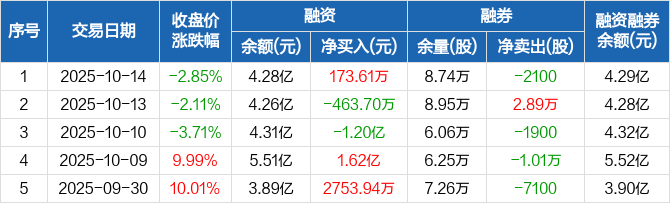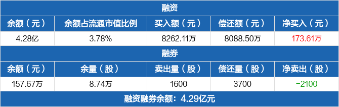 融资方面,当日融资买入8262.11万元,融资偿还8088.5万元,融资净买入173.61万元。融券方面,融券卖出1600股,融券偿还3700股,融券余量8.74万股,融券余额157.67万元。融资融券余额合计4.29亿元。