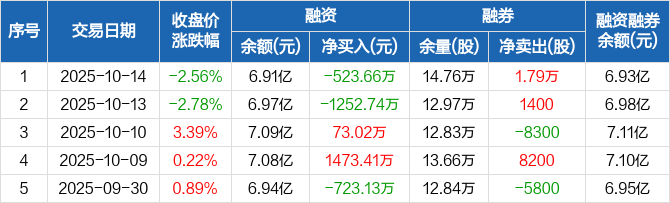 融资方面,当日融资买入4427.1万元,融资偿还4950.76万元,融资净偿还523.66万元。融券方面,融券卖出1.9万股,融券偿还1100股,融券余量14.76万股,融券余额196.31万元。融资融券余额合计6.93亿元。