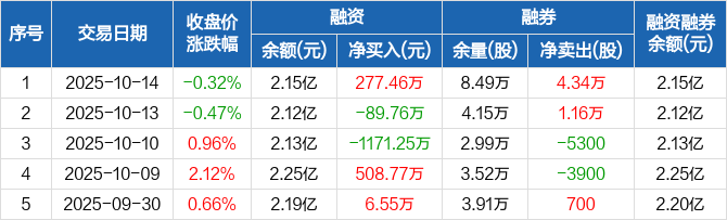 融资方面,当日融资买入923.71万元,融资偿还646.25万元,融资净买入277.46万元。融券方面,融券卖出4.54万股,融券偿还2000股,融券余量8.49万股,融券余额53.23万元。融资融券余额合计2.15亿元。
