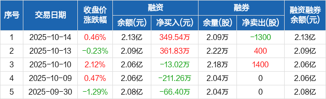 融资方面,当日融资买入1024.38万元,融资偿还674.84万元,融资净买入349.54万元。融券方面,融券卖出0股,融券偿还1300股,融券余量2.09万股,融券余额18.16万元。融资融券余额合计2.13亿元。