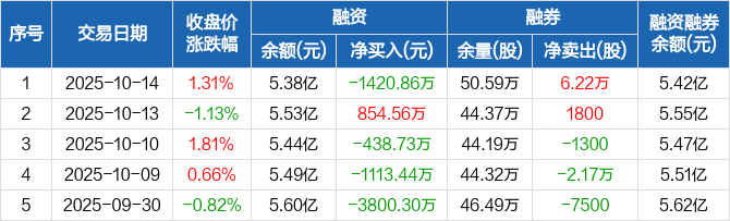 融资方面,当日融资买入1527.8万元,融资偿还2948.66万元,融资净偿还1420.86万元。融券方面,融券卖出6.69万股,融券偿还4700股,融券余量50.59万股,融券余额313.15万元。融资融券余额合计5.42亿元。