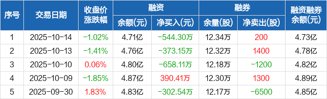 融资方面,当日融资买入2177.27万元,融资偿还2721.57万元,融资净偿还544.3万元,连续3日净偿还累计1575.56万元。融券方面,融券卖出200股,融券偿还0股,融券余量12.34万股,融券余额204.35万元。融资融券余额合计4.73亿元。
