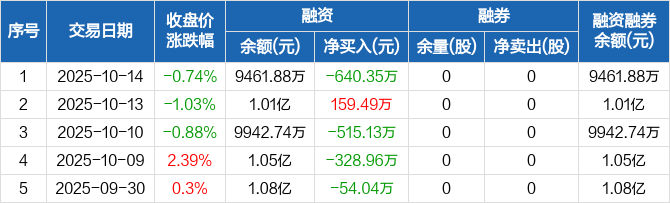 融资方面,当日融资买入579.74万元,融资偿还1220.1万元,融资净偿还640.35万元。融券方面,融券卖出0股,融券偿还0股,融券余量0股,融券余额0元。融资融券余额合计9461.88万元。