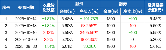 融资方面,当日融资买入4021.64万元,融资偿还5213.37万元,融资净偿还1191.73万元。融券方面,融券卖出0股,融券偿还100股,融券余量1800股,融券余额1.42万元。融资融券余额合计5.48亿元。