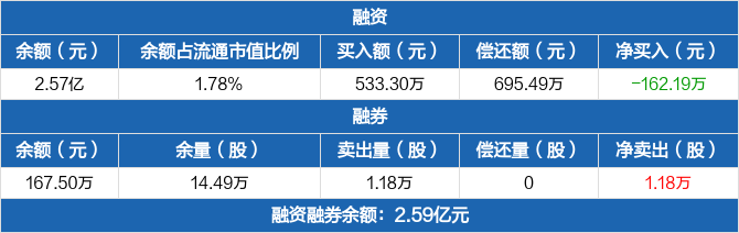 融资方面,当日融资买入533.3万元,融资偿还695.49万元,融资净偿还162.19万元。融券方面,融券卖出1.18万股,融券偿还0股,融券余量14.49万股,融券余额167.5万元。融资融券余额合计2.59亿元。