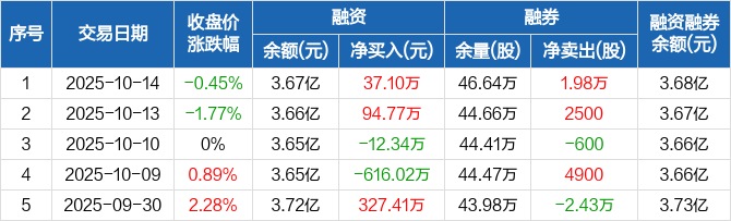 融资方面,当日融资买入1201.47万元,融资偿还1164.38万元,融资净买入37.1万元。融券方面,融券卖出1.98万股,融券偿还0股,融券余量46.64万股,融券余额103.07万元。融资融券余额合计3.68亿元。