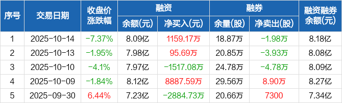 融资方面,当日融资买入1.6亿元,融资偿还1.48亿元,融资净买入1159.17万元。融券方面,融券卖出8800股,融券偿还2.86万股,融券余量18.87万股,融券余额861.19万元。融资融券余额合计8.18亿元。