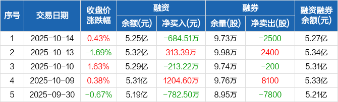 融资方面,当日融资买入906.57万元,融资偿还1591.07万元,融资净偿还684.51万元。融券方面,融券卖出0股,融券偿还2500股,融券余量9.73万股,融券余额204.23万元。融资融券余额合计5.27亿元。