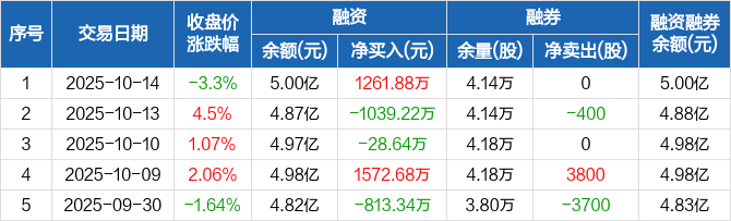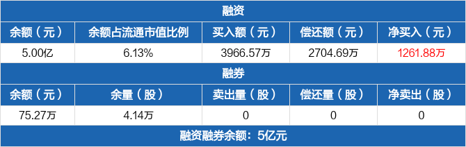 融资方面,当日融资买入3966.57万元,融资偿还2704.69万元,融资净买入1261.88万元。融券方面,融券卖出0股,融券偿还0股,融券余量4.14万股,融券余额75.27万元。融资融券余额合计5亿元。