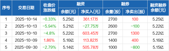 融资方面,当日融资买入3627.71万元,融资偿还3266.55万元,融资净买入361.17万元。融券方面,融券卖出100股,融券偿还0股,融券余量2700股,融券余额32.4万元。融资融券余额合计5.25亿元。