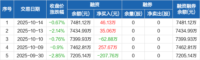融资方面,当日融资买入454.48万元,融资偿还408.35万元,融资净买入46.13万元。融券方面,融券卖出0股,融券偿还0股,融券余量0股,融券余额0元。融资融券余额合计7481.12万元。