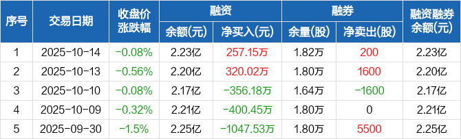 融资方面,当日融资买入1097.69万元,融资偿还840.54万元,融资净买入257.15万元。融券方面,融券卖出200股,融券偿还0股,融券余量1.82万股,融券余额22.46万元。融资融券余额合计2.23亿元。