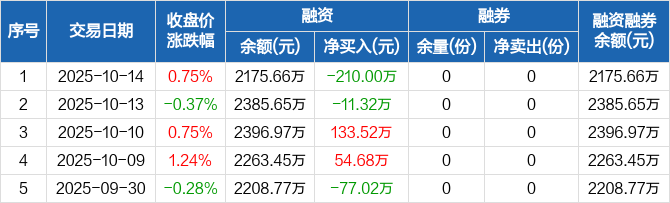融资方面,当日融资买入61.41万元,融资偿还271.41万元,融资净偿还210万元。融券方面,融券卖出0份,融券偿还0份,融券余量0份,融券余额0元。融资融券余额合计2175.66万元。
