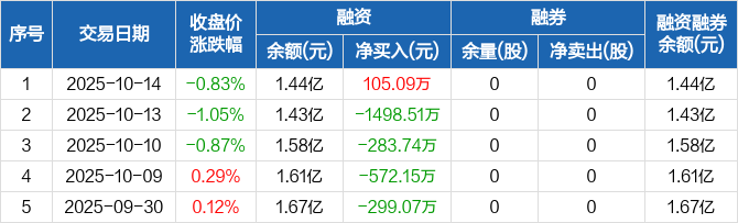 融资方面,当日融资买入676万元,融资偿还570.92万元,融资净买入105.09万元。融券方面,融券卖出0股,融券偿还0股,融券余量0股,融券余额0元。融资融券余额合计1.44亿元。