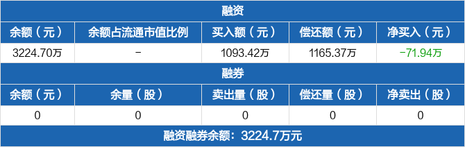融资方面,当日融资买入1093.42万元,融资偿还1165.37万元,融资净偿还71.94万元。融券方面,融券卖出0份,融券偿还0份,融券余量0份,融券余额0元。融资融券余额合计3224.7万元。