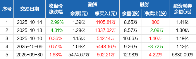 裕同科技融资融券信息显示,2025年10月14日融资净买入1105.81万元;融资余额1.39亿元,创历史新高,较前一日增加8.64%。
