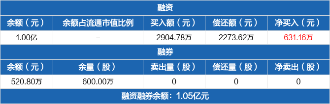 融资方面,当日融资买入2904.78万元,融资偿还2273.62万元,融资净买入631.16万元。融券方面,融券卖出0份,融券偿还0份,融券余量600万份,融券余额520.8万元。融资融券余额合计1.05亿元。