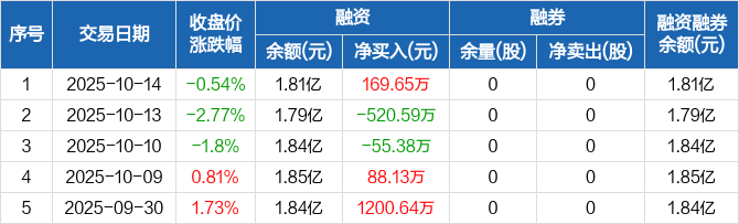 融资方面,当日融资买入1355.8万元,融资偿还1186.15万元,融资净买入169.65万元。融券方面,融券卖出0股,融券偿还0股,融券余量0股,融券余额0元。融资融券余额合计1.81亿元。