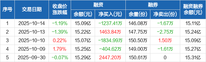 融资方面,当日融资买入6.13亿元,融资偿还6.25亿元,融资净偿还1237.41万元。融券方面,融券卖出1500份,融券偿还1.82万份,融券余量146.08万份,融券余额194.43万元。融资融券余额合计15.11亿元。