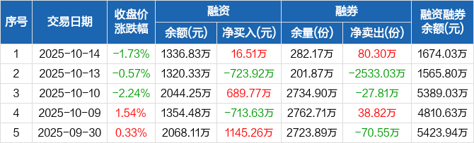 融资方面,当日融资买入447.96万元,融资偿还431.45万元,融资净买入16.51万元。融券方面,融券卖出88.83万份,融券偿还8.53万份,融券余量282.17万份,融券余额337.19万元。融资融券余额合计1674.03万元。