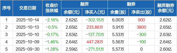 融资方面,当日融资买入572.89万元,融资偿还875.04万元,融资净偿还302.15万元。融券方面,融券卖出900股,融券偿还0股,融券余量6万股,融券余额35.34万元。融资融券余额合计2.62亿元。