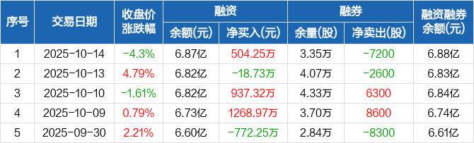 融资方面,当日融资买入1.1亿元,融资偿还1.05亿元,融资净买入504.25万元。融券方面,融券卖出2000股,融券偿还9200股,融券余量3.35万股,融券余额131.34万元。融资融券余额合计6.88亿元。