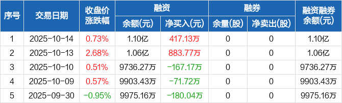 融资方面,当日融资买入780.49万元,融资偿还363.36万元,融资净买入417.13万元。融券方面,融券卖出0股,融券偿还0股,融券余量0股,融券余额0元。融资融券余额合计1.1亿元。