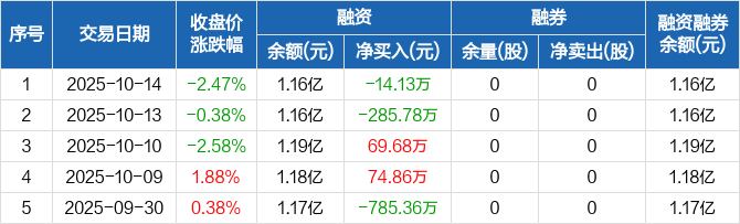 融资方面,当日融资买入789.69万元,融资偿还803.81万元,融资净偿还14.13万元。融券方面,融券卖出0股,融券偿还0股,融券余量0股,融券余额0元。融资融券余额合计1.16亿元。