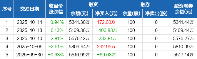 融资方面,当日融资买入458.13万元,融资偿还286.13万元,融资净买入172万元。融券方面,融券卖出0股,融券偿还0股,融券余量100股,融券余额1471元。融资融券余额合计5341.44万元。