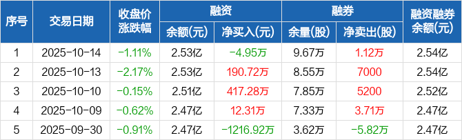融资方面,当日融资买入1160.57万元,融资偿还1165.52万元,融资净偿还4.95万元。融券方面,融券卖出1.12万股,融券偿还0股,融券余量9.67万股,融券余额60.34万元。融资融券余额合计2.54亿元。