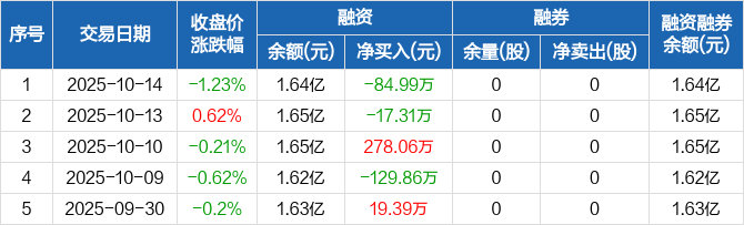 融资方面,当日融资买入567.31万元,融资偿还652.3万元,融资净偿还84.99万元。融券方面,融券卖出0股,融券偿还0股,融券余量0股,融券余额0元。融资融券余额合计1.64亿元。