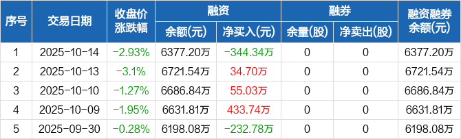 融资方面,当日融资买入425.71万元,融资偿还770.05万元,融资净偿还344.34万元。融券方面,融券卖出0股,融券偿还0股,融券余量0股,融券余额0元。融资融券余额合计6377.2万元。