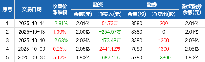 融资方面,当日融资买入2809.61万元,融资偿还2757.87万元,融资净买入51.73万元。融券方面,融券卖出500股,融券偿还300股,融券余量8580股,融券余额19.26万元。融资融券余额合计2.01亿元。