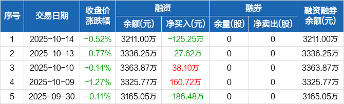 融资方面,当日融资买入132.71万元,融资偿还257.95万元,融资净偿还125.25万元。融券方面,融券卖出0股,融券偿还0股,融券余量0股,融券余额0元。融资融券余额合计3211万元。